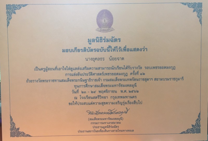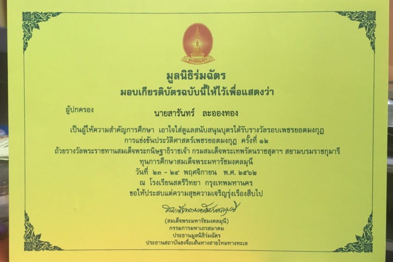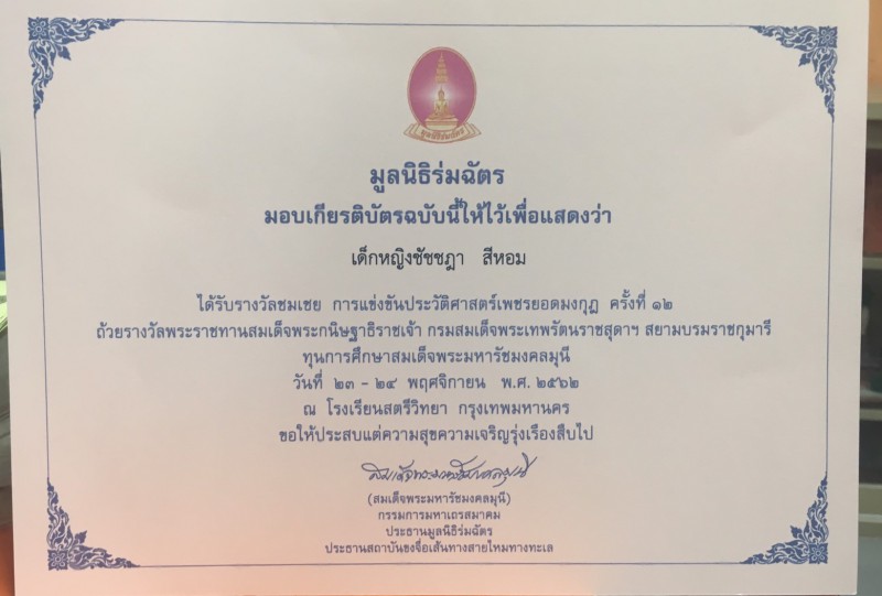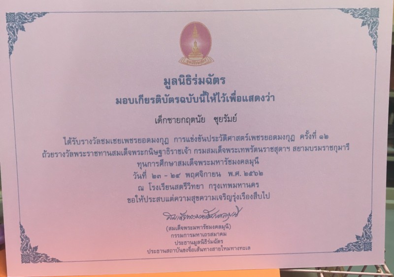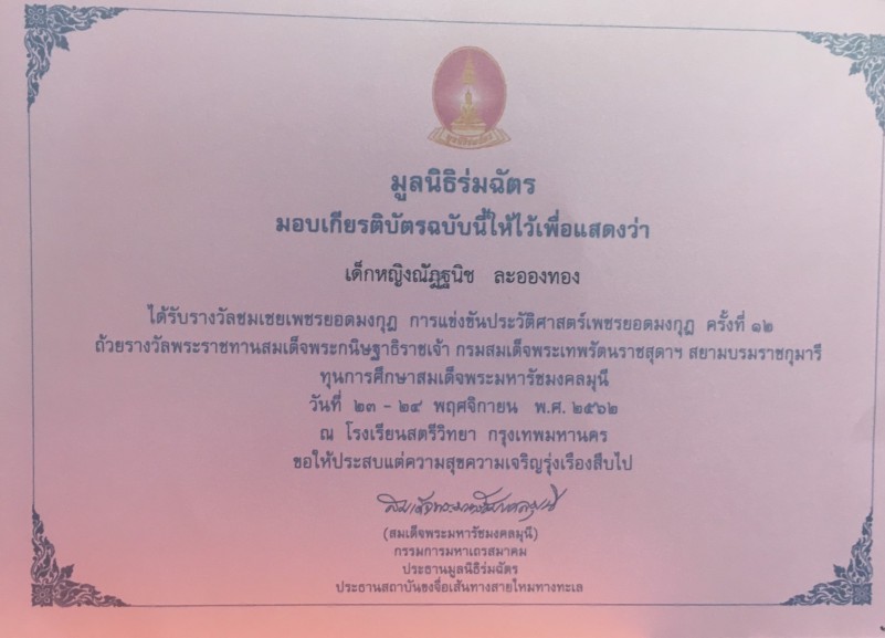 ขอแสดงความยินดีกับ นักเรียน แข่งประวัติศาสตร์เพชรยอดมงกุฎ ครั้งที่ 12 เมื่อวันที่ 24 พฤศจิกายน 2562 จัดโดยมูลนิธิร่มฉัตร