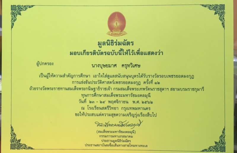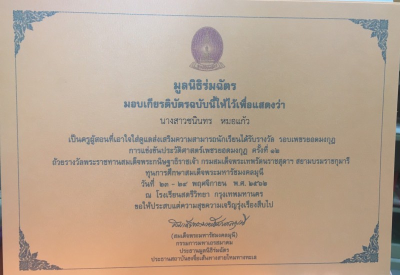 ขอแสดงความยินดีกับนักเรียนคณะครู ผู้ปกครอง ในการสอบแข่งขันประวัติศาสตร์เพชรยอดมงกุฏ ครั้งที่ 12 แข่งเมื่อวันที่ 24 พฤศจิกายน 2562 ณ โรงเรียนสตรีวิทยา กรุงเทพมหานคร