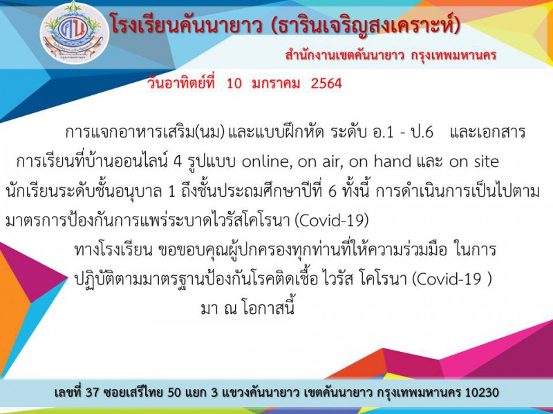 โรงเรียนคันนายาว (ธารินเจริญสงเคราะห์) ขอขอบคุณผู้ปกครองทุกท่านที่ให้ความร่วมมือ ในการปฏิบัติตามมาตรฐานป้องกันโรคติดเชื้อไวรัสโคโรนา (Covid-19 )เป็นอย่างดี
