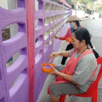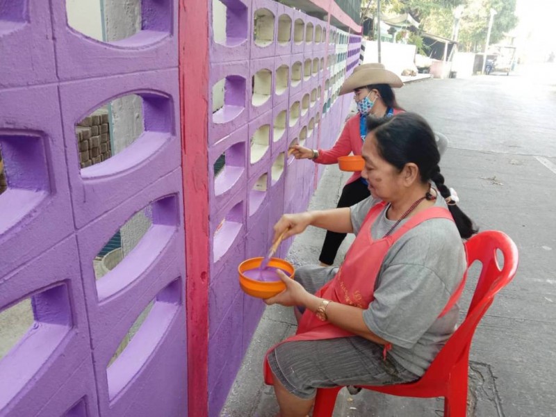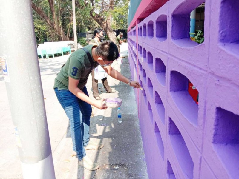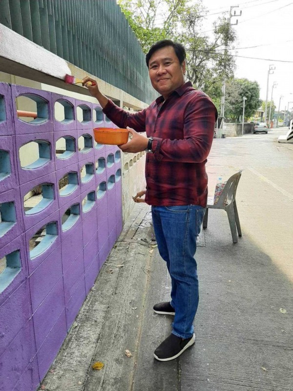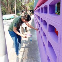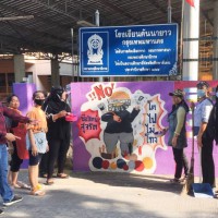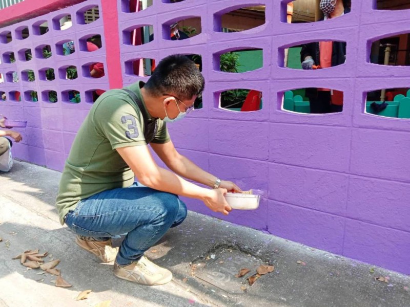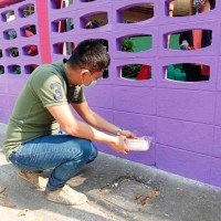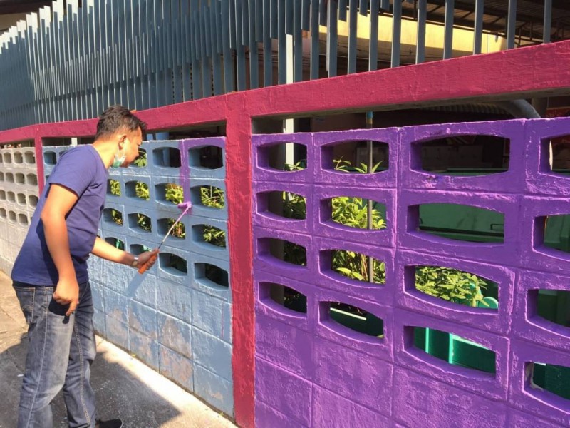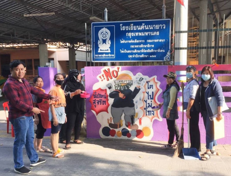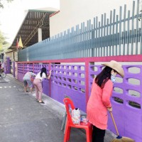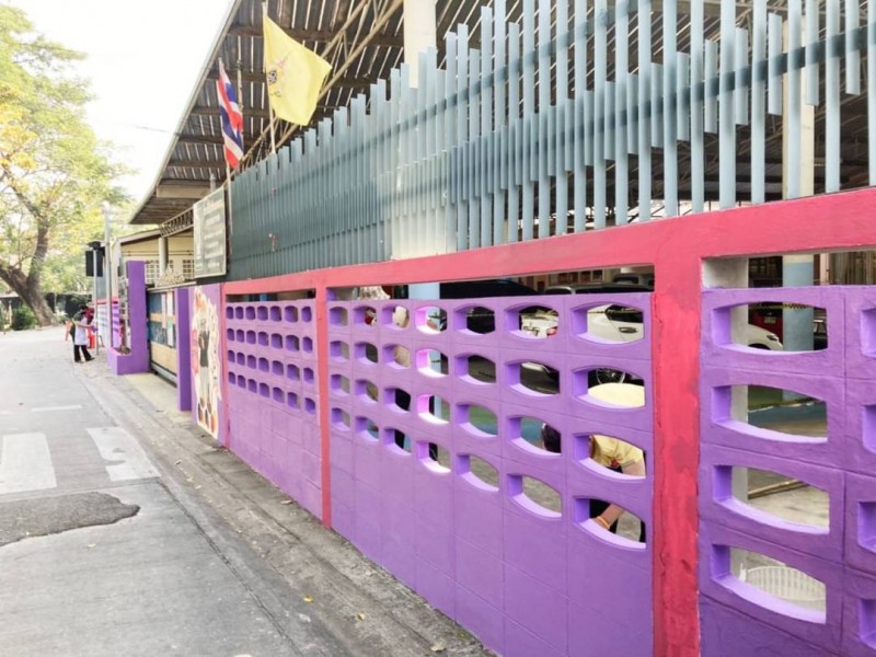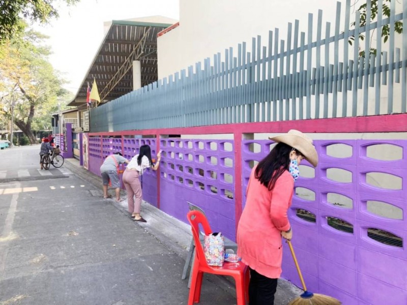 คณะผู้บริหาร ครู และบุคลากรทางการศึกษา พนักงานสถานที่ร่วมกันทาสีกำแพงโรงเรียน