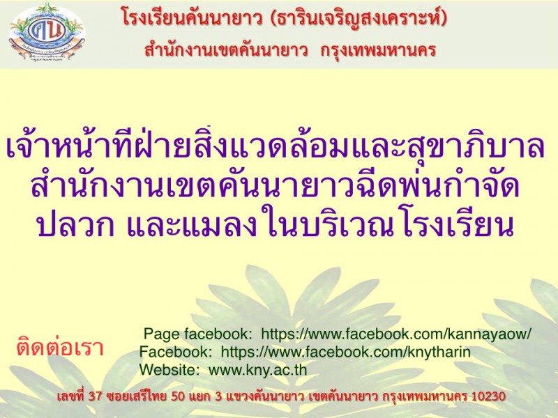 โรงเรียนคันนายาว(ธารินเจริญสงเคราะห์) ขอขอบพระคุณนายชูชาติ พุ่มน้อย ผู้อำนวยการเขตคันนายาว มอบหมายให้เจ้าหน้าที่ฝ่ายสิ่งแวดล้อม และสุขาภิบาล ลงพื้นที่ดำเนินการฉีดพ่นกำจัดปลวก แมลงต่าง ๆ ภายในบริเวณห้องสมุด และอาคารภายในโรงเรียน เพื่อให้เกิดความปลอดภัยแก่นักเรียน และบุคลากรในโรงเรียนคันนายาว(ธารินเจริญสงเคราะห์)