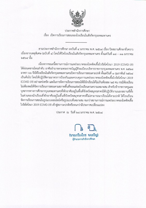 เรื่อง เปิดการเรียนการสอนของโรงเรียนสังกัดกรุงเทพมหานคร
