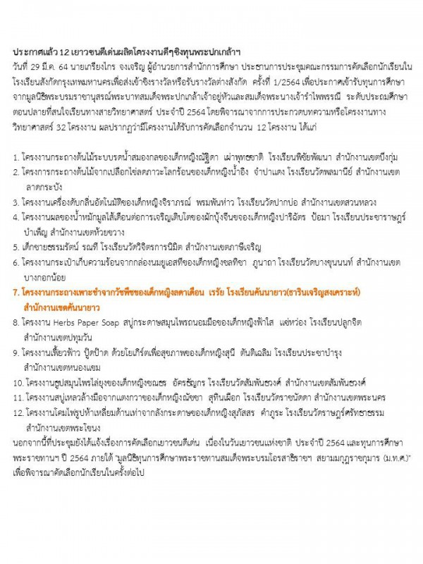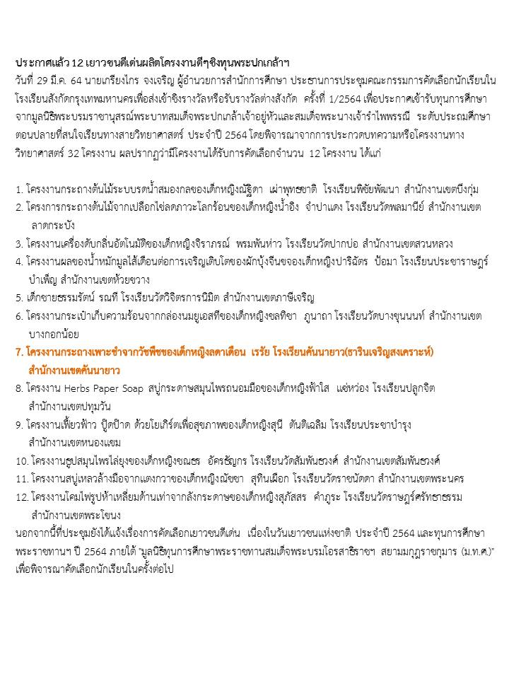 ขอแสดง ความยินดี กับนักเรียน เด็กหญิงลดาเดือน เรรัย ได้รับทุนการศึกษาจากมูลนิธิพระบรมราชานุสรณ์พระบาทสมเด็จพระปกเกล้าเจ้าอยู่หัวและสมเด็จพระนางเจ้ารำไพพรรณี ระดับประถมศึกษาตอนปลายที่สนใจเรียนทางสายวิทยาศาสตร์ ประจำปี 2564