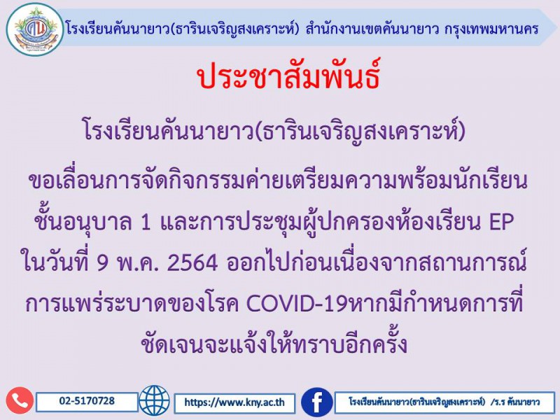 โรงเรียนคันนายาว(ธารินเจริญสงเคราะห์) ขอเลื่อนการจัดกิจกรรมค่ายเตรียมความพร้อมนักเรียนอนุบาล 1 และการประชุมผปค.ห้องเรียน EP ในวันที่ 9 พ.ค 64 ออกไปก่อนเนื่องจากสถานการณ์การแพร่ระบาดของโรค COVID-19 หากมีกำหนดการชัดเจนจะแจ้งให้ทราบอีกครั้ง |