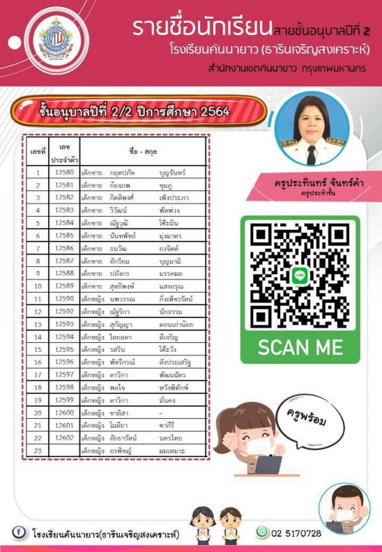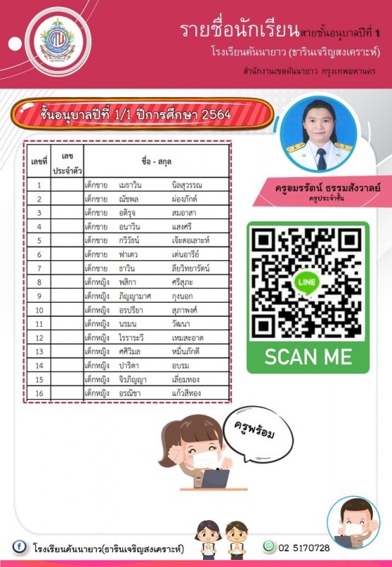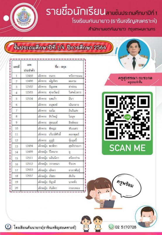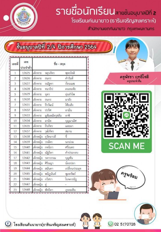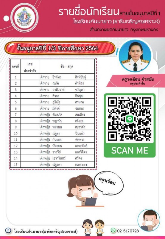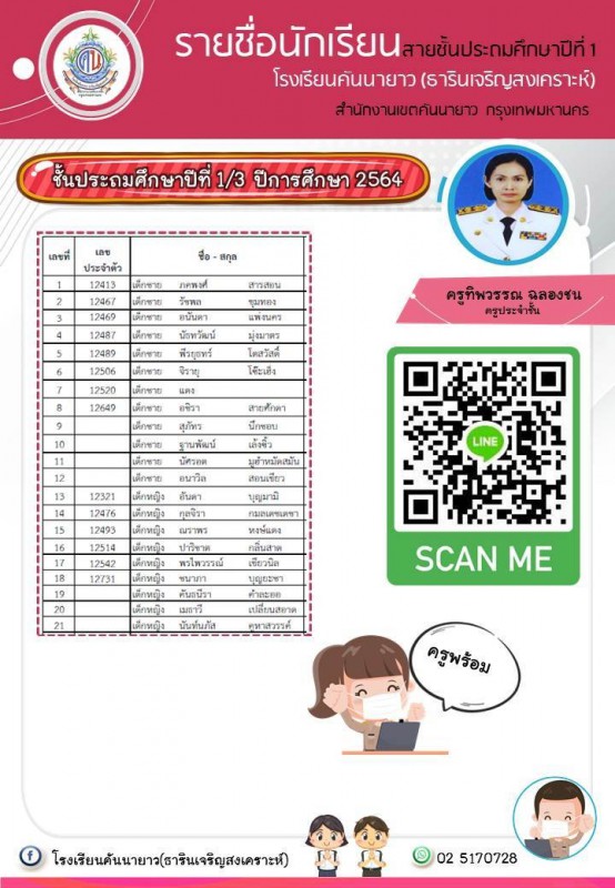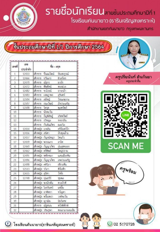 โรงเรียนคันนายาว(ธารินเจริญสงเคราะห์) สำนักงานเขตคันนายาว โดยการนำของนายชัยยนต์ เสรีเรืองยุทธ ผู้อำนวยการสถานศึกษา ขอประชาสัมพันธ์ เรื่อง รายชื่อนักเรียนระดับชั้นอนุบาล 1 – ระดับชั้นประถมศึกษาประถมศึกษาปีที่ 6 และครูประจำชั้น ภาคเรียนที่ 1 ปีการศึกษา 2564 ตามเอกสารที่แนบมาพร้อมกันนี้ นักเรียนและผู้ปกครอง สามารถตรวจสอบรายชื่อ และสแกน QR CODE เข้ากลุ่มห้องเรียน ได้ เลย
