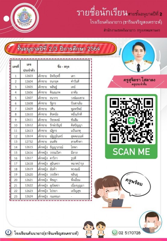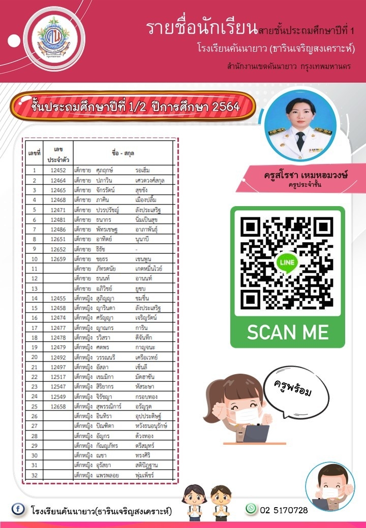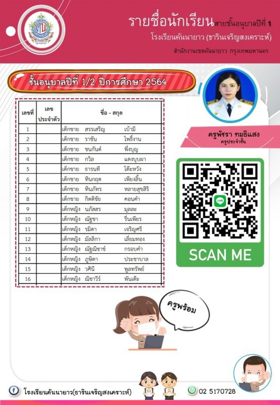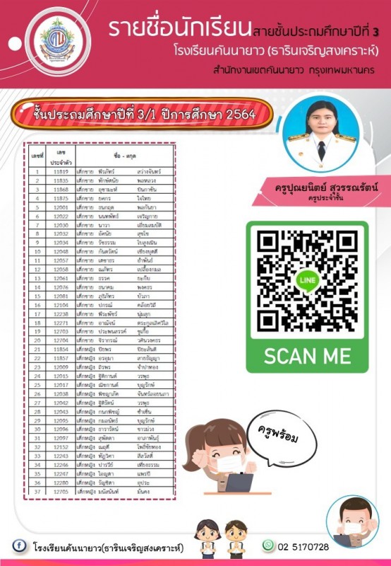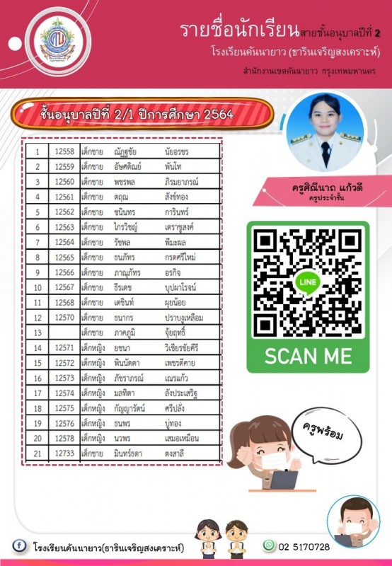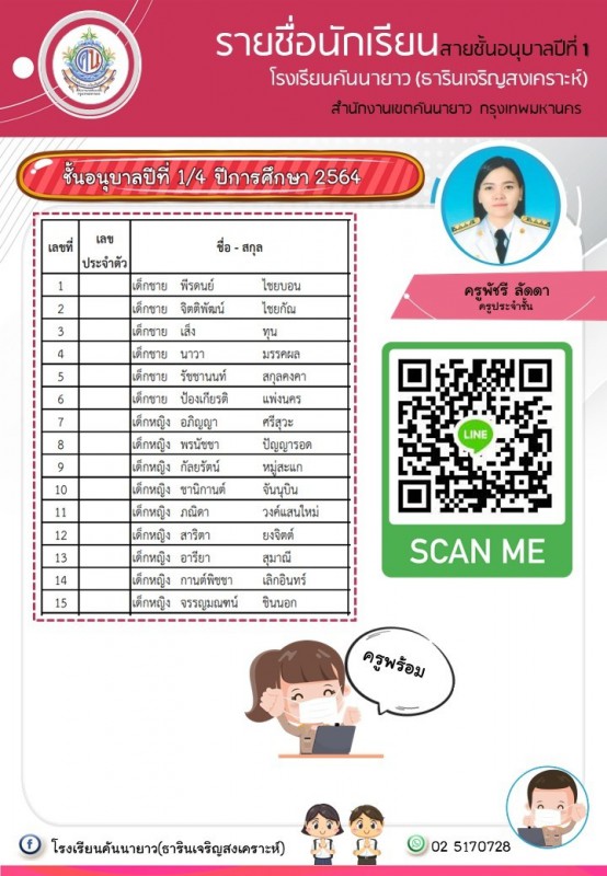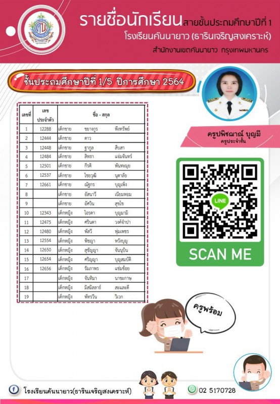 โรงเรียนคันนายาว(ธารินเจริญสงเคราะห์) สำนักงานเขตคันนายาว โดยการนำของนายชัยยนต์ เสรีเรืองยุทธ ผู้อำนวยการสถานศึกษา ขอประชาสัมพันธ์ เรื่อง รายชื่อนักเรียนระดับชั้นอนุบาล 1 – ระดับชั้นประถมศึกษาประถมศึกษาปีที่ 6 และครูประจำชั้น ภาคเรียนที่ 1 ปีการศึกษา 2564 ตามเอกสารที่แนบมาพร้อมกันนี้ นักเรียนและผู้ปกครอง สามารถตรวจสอบรายชื่อ และสแกน QR CODE เข้ากลุ่มห้องเรียน ได้ เลย