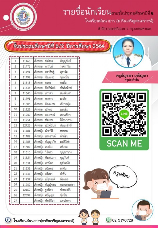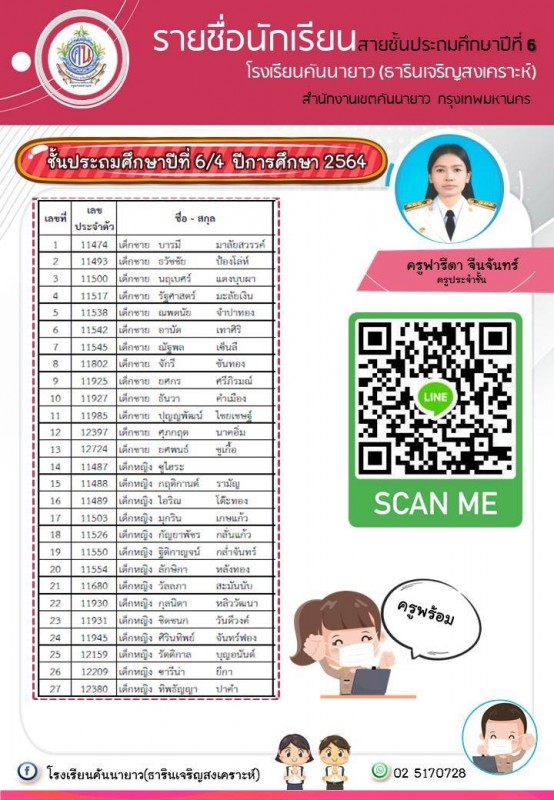 โรงเรียนคันนายาว(ธารินเจริญสงเคราะห์) สำนักงานเขตคันนายาว โดยการนำของนายชัยยนต์ เสรีเรืองยุทธ ผู้อำนวยการสถานศึกษา ขอประชาสัมพันธ์ เรื่อง รายชื่อนักเรียนระดับชั้นอนุบาล 1 – ระดับชั้นประถมศึกษาประถมศึกษาปีที่ 6 และครูประจำชั้น ภาคเรียนที่ 1 ปีการศึกษา 2564 ตามเอกสารที่แนบมาพร้อมกันนี้ นักเรียนและผู้ปกครอง สามารถตรวจสอบรายชื่อ และสแกน QR CODE เข้ากลุ่มห้องเรียน ได้ เลย