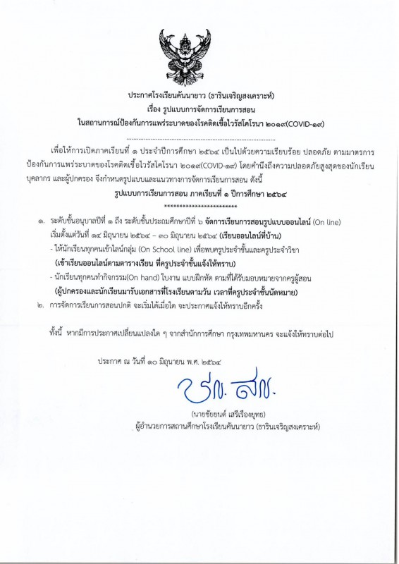เรื่องการจัดการเรียนการสอนช่วงสถานการณ์การแพร่ระบาดของเชื้อไวรัสโคโรนา2019 (Covid-19) ซึ่งได้แนบ ประกาศและตารางเรียนให้นักเรียนและผู้ปกครองตรวจสอบและเข้าเรียนตามที่ครูผู้สอนจะได้นัดหมาย ดังรูป