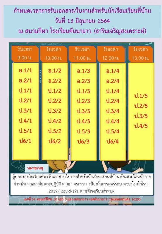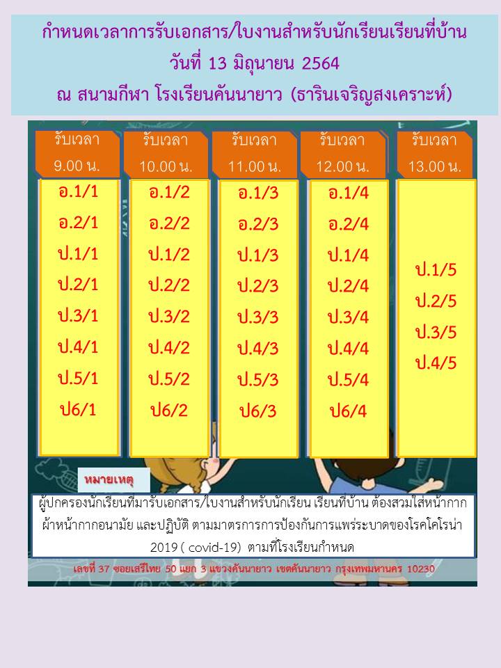 แจ้งผู้ปกครอง มารับเอกสาร On Hand เพื่อให้นักเรียนได้ใช้ประกอบในการเรียนที่บ้าน ใน วันที่ 13 มิถุนายน 2564 ณ ลานอเนกประสงค์ โรงเรียนคันนายาว(ธารินเจริญสงเคราะห์)