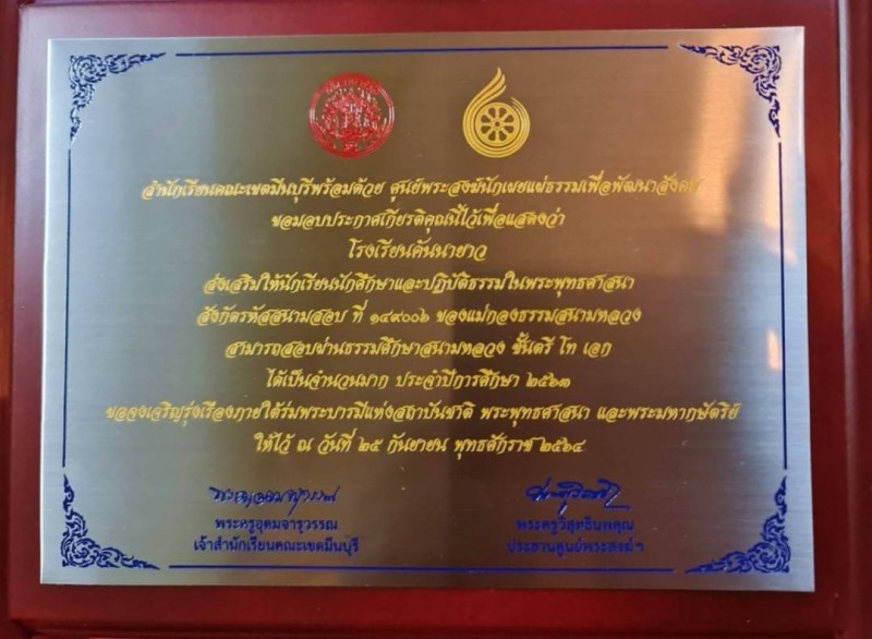 รับโล่ห์เกียรติคุณ และเงินสนับสนุน สนามสอบธรรมศึกษา 2564