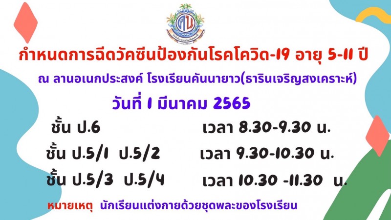 ขอแจ้ง ประชาสัมพันธ์ กำหนดการฉีดวัคซีน ป้องกันโรคโควิด-19 นักเรียน อายุ5-11ปี