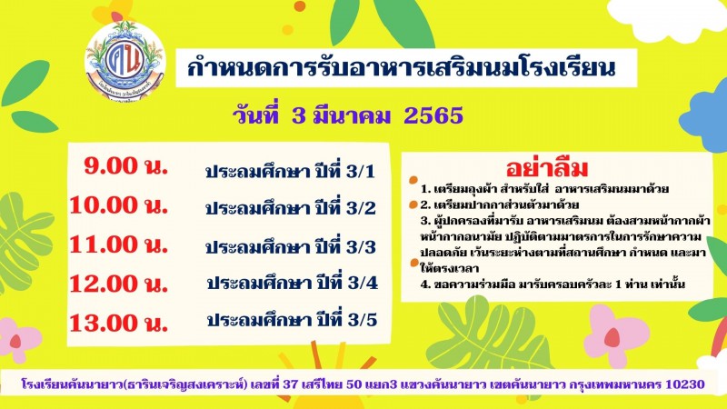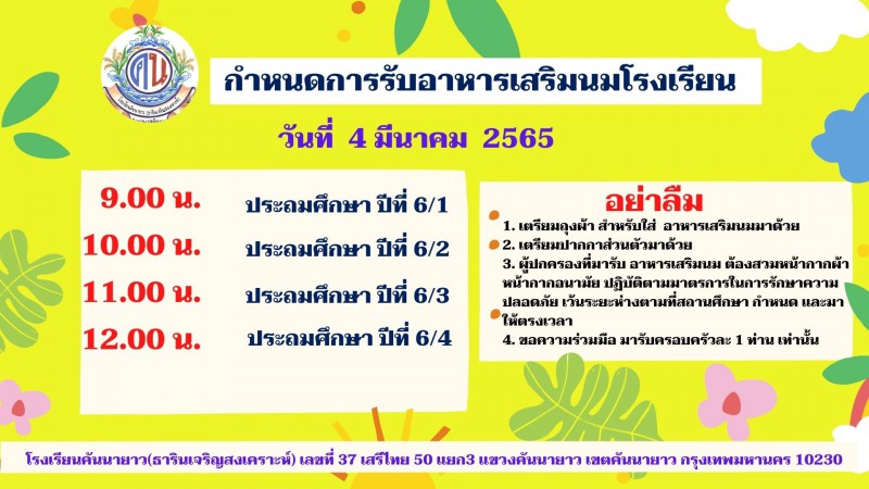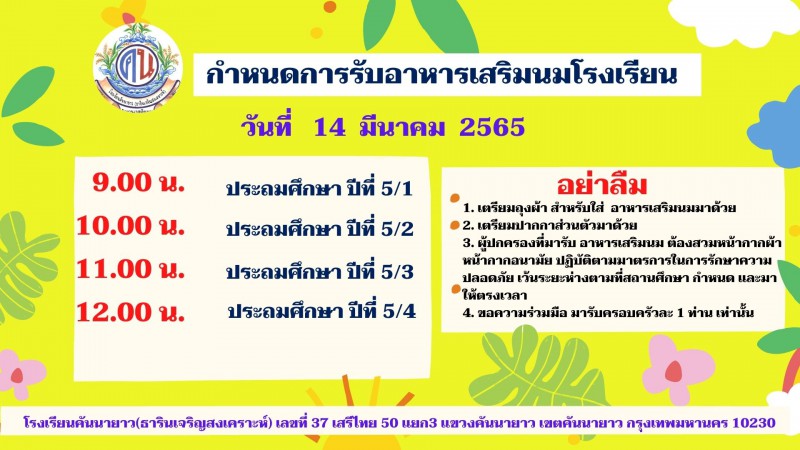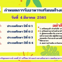 กำหนดการรับนมโรงเรียน เดือนมีนาคม 2565