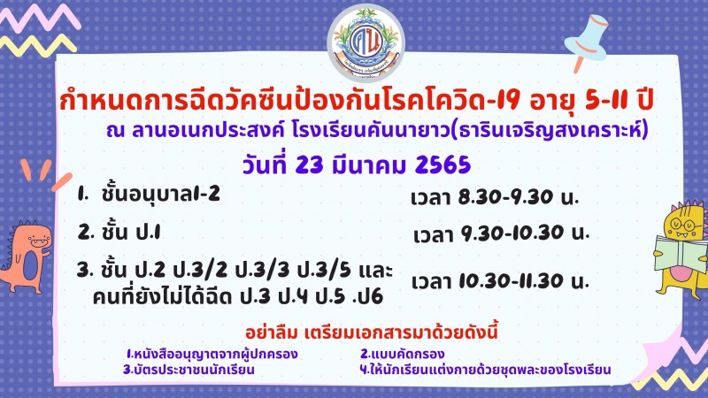ขอ แจ้ง กำหนดการ ฉีดวัคซีน ป้องกัน โรค โควิด -19 สำหรับเด็ก อายุ 5-11 ปี วันที่ 23 มีนาคม 2565