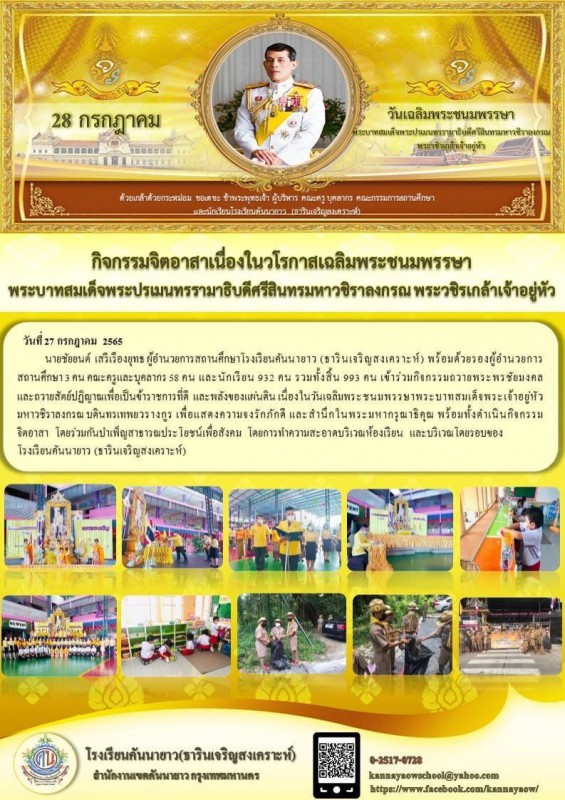 นายชัยยนต์ เสรีเรืองยุทธ ผู้อำนวยการสถานศึกษาโรงเรียนคันนายาว (ธารินเจริญสงเคราะห์) พร้อมด้วยรองผู้อำนวยการสถานศึกษา คณะครู และนักเรียน เข้าร่วมกิจกรรมเนื่องในวันเฉลิมพระชนมพรรษาพระบาทสมเด็จพระเจ้าอยู่หัวมหาวชิราลงกรณ บดินทรเทพยวรางกูร 28 กรกฎาคม 2565