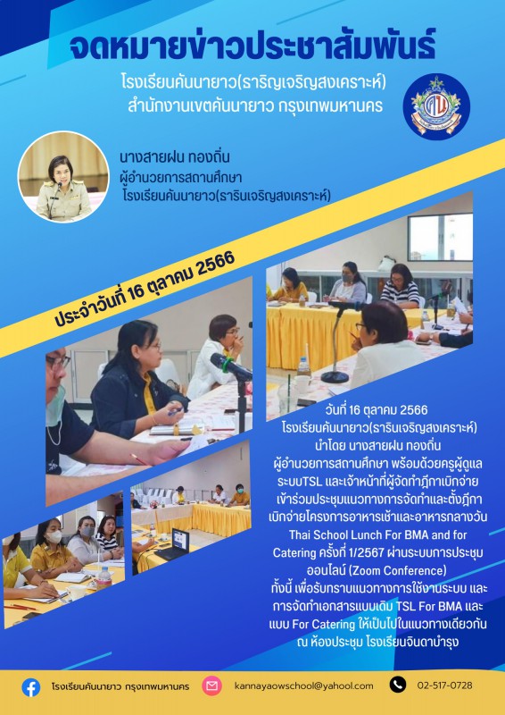 โรงเรียนคันนายาว(ธารินเจริญสงเคราะห์) นำโดย นางสายฝน ทองถิ่น ผู้อำนวยการสถานศึกษา พร้อมด้วยครูผู้ดูแลระบบTSL และเจ้าหน้าที่ผู้จัดทำฎีกาเบิกจ่าย เข้าร่วมประชุมแนวทางการจัดทำและตั้งฎีกาเบิกจ่ายโครงการอาหารเช้าและอาหารกลางวัน Thai School Lunch For BMA and for Catering ครั้งที่ 1/2567 ผ่านระบบการประชุมออนไลน์ (Zoom Conference)