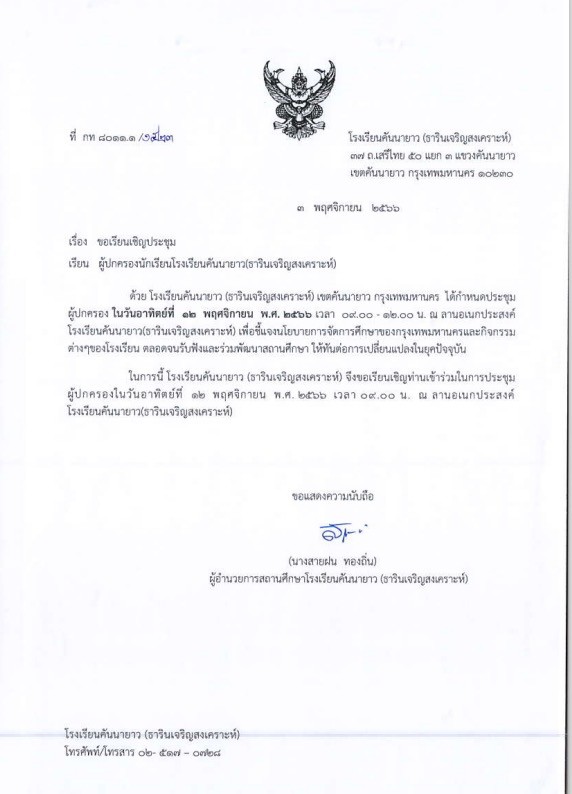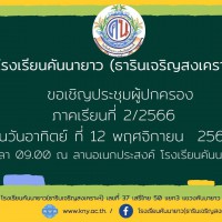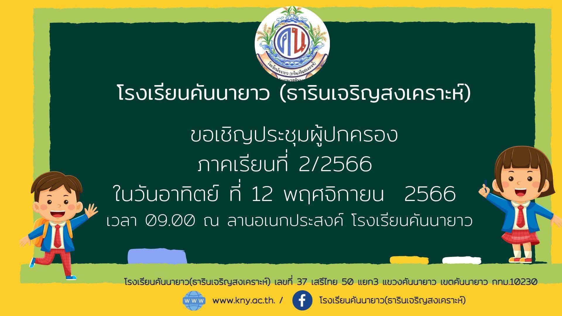 ขอเชิญประชุม ผู้ปกครองภาคเรียนที่ 2/2566 ในวันอาทิตย์ ที่ 12 พฤศจิกายน 2566. เวลา 09.00 โรงเรียนคันนายาว (ธารินเจริญสงเคราะห์)