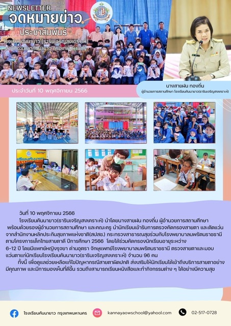 โรงเรียนคันนายาว(ธารินเจริญสงเคราะห์) นำโดยนางสายฝน ทองถิ่น ผู้อำนวยการสถานศึกษา พร้อมด้วยรองผู้อำนวยการสถานศึกษา และคณะครู นำนักเรียนเข้ารับการตรวจคัดกรองสายตา และตัดแว่นจากสำนักงานหลักประกันสุขภาพแห่งชาติ(สปสช.) กระทรวงสาธารณสุขร่วมกับโรงพยาบาลนพรัตนราชธานี ตามโครงการเด็กไทยสายตาดี ปีการศึกษา 2566 โดยได้ร่วมคัดกรองนักเรียนอายุระหว่าง 6-12 ปี โดยมีแพทย์หญิงรุจยา ด่านอุตรา จักษุแพทย์โรงพยาบาลนพรัตนราชธานี ตรวจสายตาและมอบแว่นตาแก่นักเรียนโรงเรียนคันนายาว(ธารินเจริญสงเคราะห์) จำนวน 96 คน