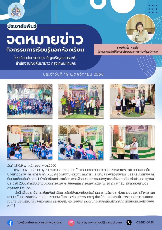 นางสายฝน ทองถิ่น ผู้อำนวยการสถานศึกษา โรงเรียนคันนายาว(ธารินเจริญสงเคราะห์) มอบหมายให้ นางสาวอำไพ ตระการดี ตำแหน่ง ครู วิทยฐานะครูชำนาญการ และนางสาวพลอยไพลิน มูลสูตร ตำแหน่ง ครู รับเงินเดือนอันดับ คศ.1 นำนักเรียนเข้าร่วมโครงการฝึกอบรมเยาวชนนักพูดรักษ์สิ่งแวดล้อมต่อต้านการทุจริต ประจำปี 2566 สำหรับเยาวชนเขตกรุงเทพตะวันออกและกรุงเทพเหนือ ณ เรส คิว ฟาร์ม เขตคลองสามวา กรุงเทพมหานคร