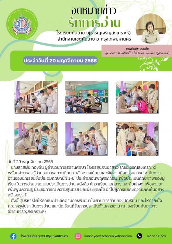 นางสายฝน ทองถิ่น ผู้อำนวยการสถานศึกษา โรงเรียนคันนายาว(ธารินเจริญสงเคราะห์)พร้อมด้วยรองผู้อำนวยการสถานศึกษา เข้าตรวจเยี่ยม และติดตามกิจกรรมการประเมินการอ่านของนักเรียนชั้นประถมศึกษาปีที่ 1-6 ประจำเดือนพฤศจิกายน เพื่อประเมินศักยภาพของผู้เรียนในการอ่านจากแบบประเมินการอ่าน หนังสือ ตำราเรียน เอกสาร และสื่อต่างๆ เพื่อหาและเพิ่มพูนความรู้ ประสบการณ์ ความสุนทรีย์ และประยุกต์ใช้ นำไปสู่การแสดงความคิดเห็นอย่างสร้างสรรค์