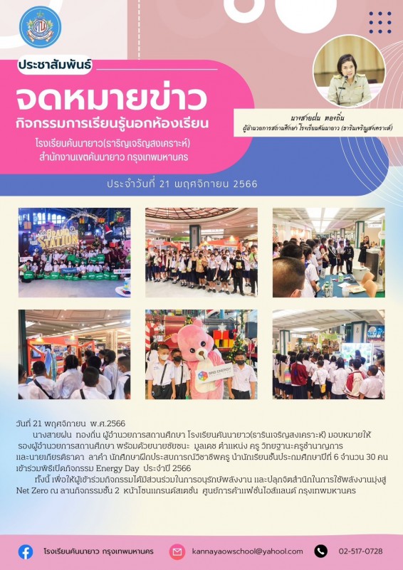 นางสายฝน ทองถิ่น ผู้อำนวยการสถานศึกษา โรงเรียนคันนายาว(ธารินเจริญสงเคราะห์) มอบหมายให้ รองผู้อำนวยการสถานศึกษา พร้อมด้วยนายชัยชนะ มูลเดช ตำแหน่ง ครู วิทยฐานะครูชำนาญการ และนายเกียรติธาดา ลาคำ นักศึกษาฝึกประสบการณ์วิชาชีพครู นำนักเรียนชั้นประถมศึกษาปีที่ 6 จำนวน 30 คน เข้าร่วมพิธีเปิดกิจกรรม Energy Day ประจำปี 2566