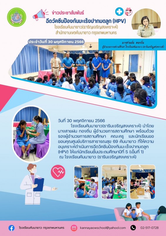 โรงเรียนคันนายาว(ธารินเจริญสงเคราะห์) นำโดยนางสายฝน ทองถิ่น ผู้อำนวยการสถานศึกษา พร้อมด้วยรองผู้อำนวยการสถานศึกษา คณะครู และนักเรียนขอขอบคุณศูนย์บริการสาธารณสุข 69 คันนายาว ที่ให้ความอนุเคราะห์ดำเนินการฉีดวัคซีนป้องกันมะเร็งปากมดลูก (HPV) ให้แก่นักเรียนชั้นประถมศึกษาปีที่ 5 (เข็มที่ 1) ณ โรงเรียนคันนายาว (ธารินเจริญสงเคราะห์)
