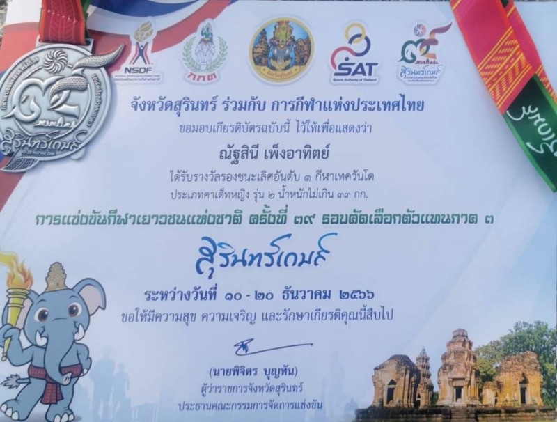 >> ขอแสดงความยินดีกับนักเรียนที่ได้รับรางวัลการแข่งขันกีฬาเยาวชนแห่งชาติ ครั้งที่ 39 รอบคัดเลือกตัวแทนภาค 3 "สุรินทร์เกมส์" จังหวัดสุรินทร์