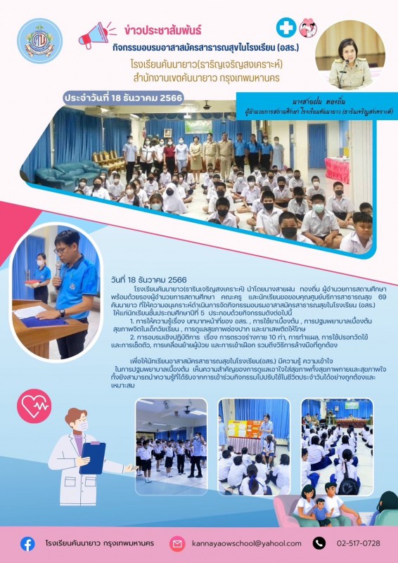 โรงเรียนคันนายาว(ธารินเจริญสงเคราะห์) นำโดยนางสายฝน ทองถิ่น ผู้อำนวยการสถานศึกษา พร้อมด้วยรองผู้อำนวยการสถานศึกษา คณะครู และนักเรียนขอขอบคุณศูนย์บริการสาธารณสุข 69 คันนายาว ที่ให้ความอนุเคราะห์ดำเนินการจัดกิจกรรมอบรมอาสาสมัครสาธารณสุขในโรงเรียน (อสร.) ให้แก่นักเรียนชั้นประถมศึกษาปีที่ 5 ประกอบด้วยกิจกรรมดังต่อไปนี้
