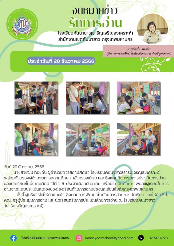 นางสายฝน ทองถิ่น ผู้อำนวยการสถานศึกษา โรงเรียนคันนายาว(ธารินเจริญสงเคราะห์)พร้อมด้วยรองผู้อำนวยการสถานศึกษา เข้าตรวจเยี่ยม และติดตามกิจกรรมการประเมินการอ่านของนักเรียนชั้นประถมศึกษาปีที่ 1-6 ประจำเดือนธันวาคม เพื่อประเมินศักยภาพของผู้เรียนในการอ่านจากแบบประเมินตนเองของโรงเรียนด้านการอ่านของนักเรียนสังกัดกรุงเทพมหานคร