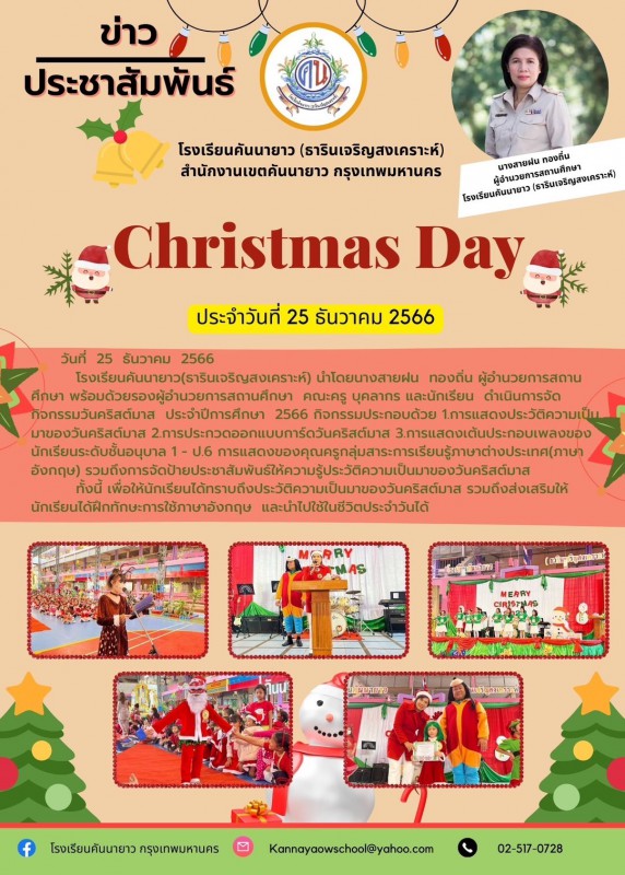 โรงเรียนคันนายาว(ธารินเจริญสงเคราะห์) นำโดยนางสายฝน ทองถิ่น ผู้อำนวยการสถานศึกษา พร้อมด้วยรองผู้อำนวยการสถานศึกษา คณะครู บุคลากร และนักเรียน ดำเนินการจัดกิจกรรมวันคริสต์มาส ประจำปีการศึกษา 2566 กิจกรรมประกอบด้วย 1.การแสดงประวัติความเป็นมาของวันคริสต์มาส 2.การประกวดออกแบบการ์ดวันคริสต์มาส 3.การแสดงเต้นประกอบเพลงของนักเรียนระดับชั้นอนุบาล 1 - ป.6 การแสดงของคุณครูกลุ่มสาระการเรียนรู้ภาษาต่างประเทศ(ภาษาอังกฤษ) รวมถึงการจัดป้ายประชาสัมพันธ์ให้ความรู้ประวัติความเป็นมาของวันคริสต์มาส