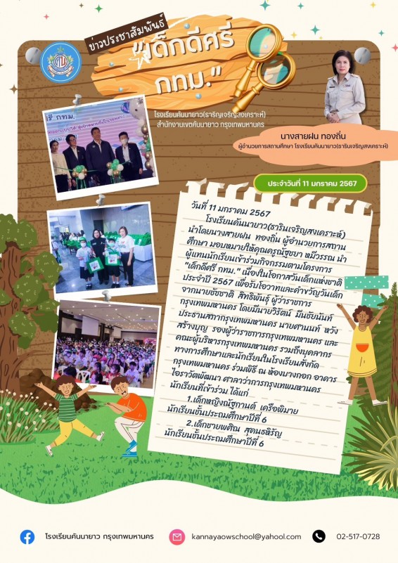 โรงเรียนคันนายาว(ธารินเจริญสงเคราะห์) นำโดยนางสายฝน ทองถิ่น ผู้อำนวยการสถานศึกษา มอบหมายให้คุณครูณัฐชยา หมีวรรณ นำผู้แทนนักเรียนเข้าร่วมกิจกรรมตามโครงการ "เด็กดีศรี กทม." เนื่องในโอกาสวันเด็กแห่งชาติประจำปี 2567 เพื่อรับโอวาทและคำขวัญวันเด็กจากนายชัชชาติ สิทธิพันธุ์ ผู้ว่าราชการกรุงเทพมหานคร โดยมีนายวิรัตน์ มีนชัยนันท์ ประธานสภากรุงเทพมหานคร นายศานนท์ หวังสร้างบุญ รองผู้ว่าราชการกรุงเทพมหานคร และคณะผู้บริหารกรุงเทพมหานคร รวมถึงบุคลากรทางการศึกษาและนักเรียนในโรงเรียนสังกัดกรุงเทพมหานคร ร่วมพิธี ณ ห้องบางกอก อาคารไอราวัตพัฒนา ศาลาว่าการกรุงเทพมหานคร นักเรียนที่เข้าร่วม ได้แก่