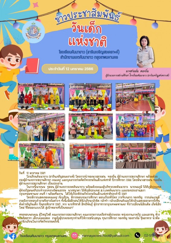 โรงเรียนคันนายาว (ธารินเจริญสงเคราะห์) โดยการนำของนางสายฝน ทองถิ่น ผู้อำนวยการสถานศึกษา พร้อมด้วยรองผู้อำนวยการสถานศึกษา คณะครู และบุคลากรร่วมจัดกิจกรรมวันเด็กแห่งชาติ ปีการศึกษา 2566 โดยมีนางสายฝน ทองถิ่น ผู้อำนวยการสถานศึกษา เป็นประธาน