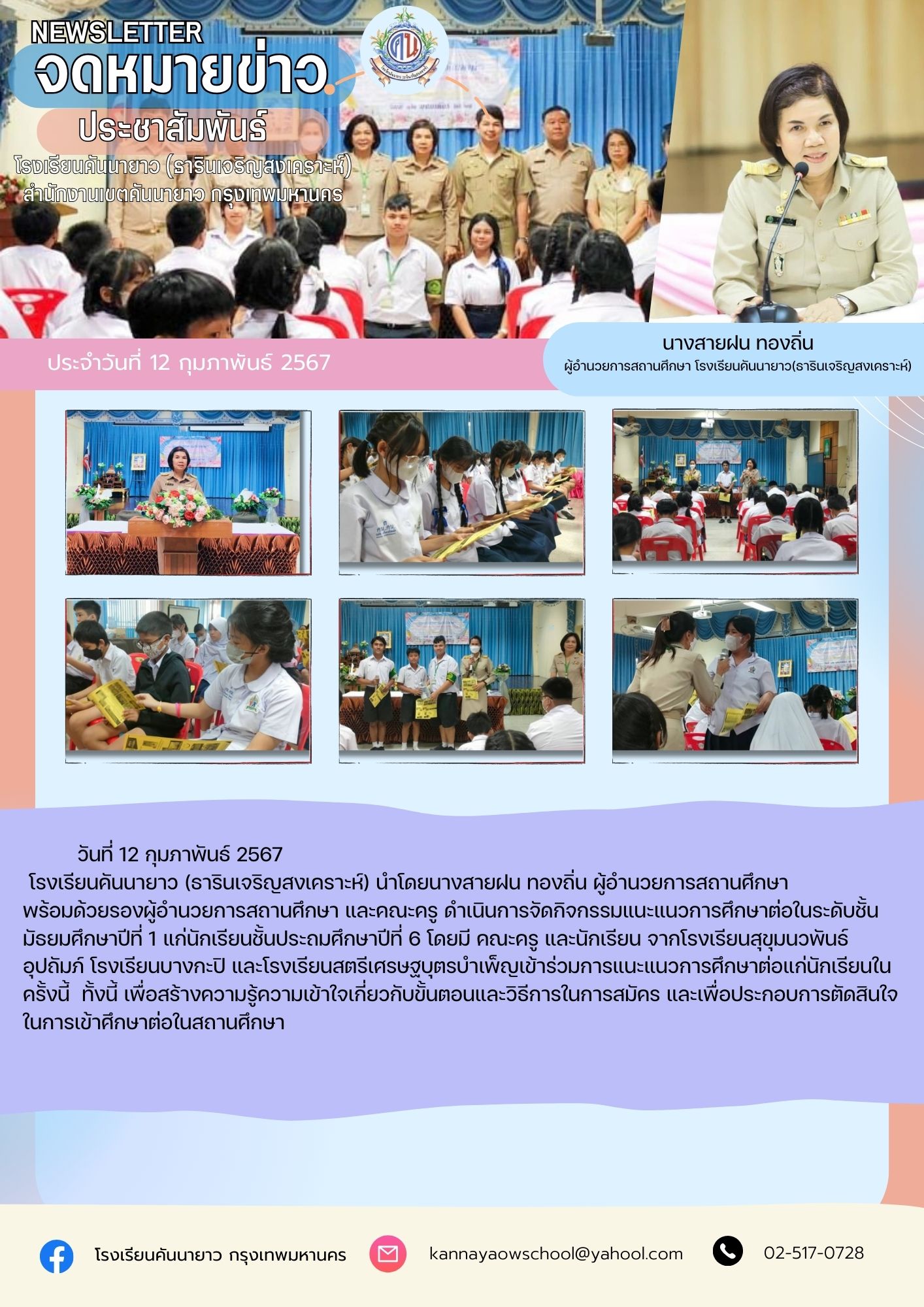 โรงเรียนคันนายาว (ธารินเจริญสงเคราะห์) นำโดยนางสายฝน ทองถิ่น ผู้อำนวยการสถานศึกษา พร้อมด้วยรองผู้อำนวยการสถานศึกษา และคณะครู ดำเนินการจัดกิจกรรมแนะแนวการศึกษาต่อในระดับชั้นมัธยมศึกษาปีที่ 1 แก่นักเรียนชั้นประถมศึกษาปีที่ 6 โดยมี คณะครู และนักเรียน จากโรงเรียนสุขุมนวพันธ์อุปถัมภ์ โรงเรียนบางกะปิ และโรงเรียนสตรีเศรษฐบุตรบําเพ็ญเข้าร่วมการแนะแนวการศึกษาต่อแก่นักเรียนในครั้งนี้