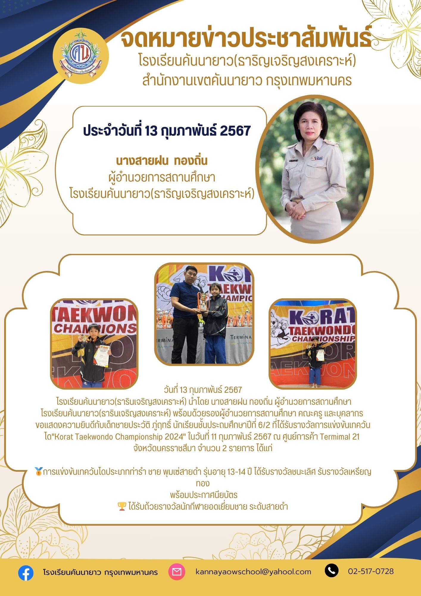 โรงเรียนคันนายาว(ธารินเจริญสงเคราะห์) นำโดย นางสายฝน ทองถิ่น ผู้อำนวยการสถานศึกษาโรงเรียนคันนายาว(ธารินเจริญสงเคราะห์) พร้อมด้วยรองผู้อำนวยการสถานศึกษา คณะครู และบุคลากร ขอแสดงความยินดีกับเด็กชายประวัติ ภู่ฤทธิ์ นักเรียนชั้นประถมศึกษาปีที่ 6/2 ที่ได้รับรางวัลการแข่งขันเทควันโด"Korat Taekwondo Championship 2024" ในวันที่ 11 กุมภาพันธ์ 2567 ณ ศูนย์การค้า Termimal 21 จังหวัดนครราชสีมา จำนวน 2 รายการ ได้แก่