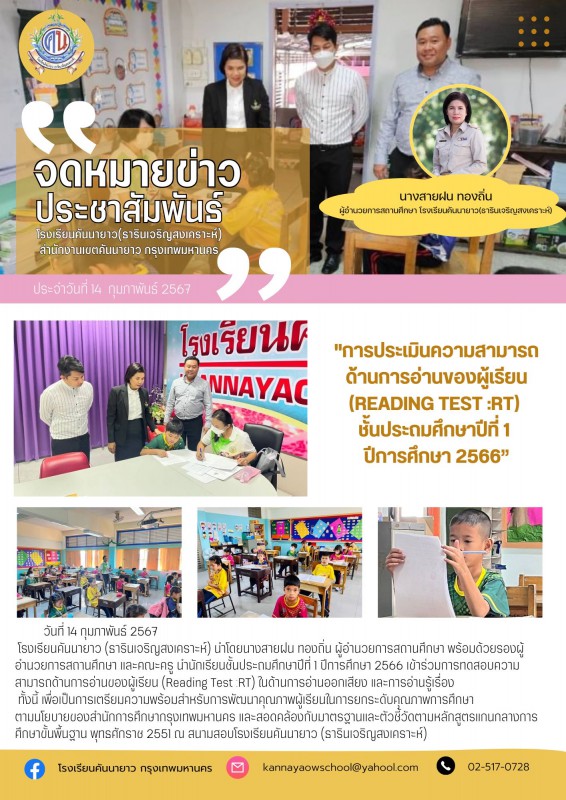 โรงเรียนคันนายาว (ธารินเจริญสงเคราะห์) นำโดยนางสายฝน ทองถิ่น ผู้อำนวยการสถานศึกษา พร้อมด้วยรองผู้อำนวยการสถานศึกษา และคณะครู นำนักเรียนชั้นประถมศึกษาปีที่ 1 ปีการศึกษา 2566 เข้าร่วมการทดสอบความสามารถด้านการอ่านของผู้เรียน (Reading Test :RT) ในด้านการอ่านออกเสียง และการอ่านรู้เรื่อง