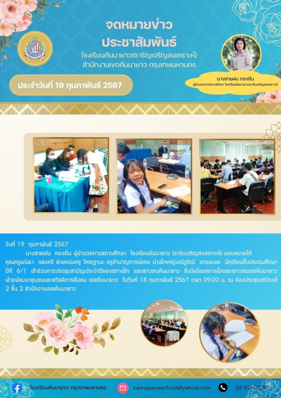 นางสายฝน ทองถิ่น ผู้อำนวยการสถานศึกษา โรงเรียนคันนายาว (ธารินเจริญสงเคราะห์) มอบหมายให้คุณครูพนิดา แสงศรี ตำแหน่งครู วิทยฐานะ ครูชำนาญการพิเศษ นำเด็กหญิงณัฐริณี อาจละออ นักเรียนชั้นประถมศึกษาปีที่ 6/1 เข้าร่วมการประชุมสามัญประจำปีของสภาเด็ก และเยาวชนคันนายาว ซึ่งจัดโดยสภาเด็กและเยาวชนเขตคันนายาว ฝ่ายพัฒนาชุมชนและสวัสดิการสังคม เขตคันนายาว ในวันที่ 18 กุมภาพันธ์ 2567 เวลา 09.00 น. ณ ห้องประชุมเสนีวงศ์ 2 ชั้น 2 สำนักงานเขตคันนายาว |