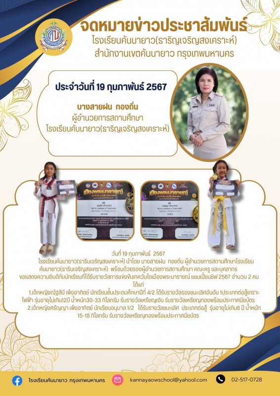 โรงเรียนคันนายาว(ธารินเจริญสงเคราะห์) นำโดย นางสายฝน ทองถิ่น ผู้อำนวยการสถานศึกษาโรงเรียนคันนายาว(ธารินเจริญสงเคราะห์) พร้อมด้วยรองผู้อำนวยการสถานศึกษา คณะครู และบุคลากร ขอแสดงความยินดีกับนักเรียนที่ได้รับรางวัลการแข่งขันเทควันโดเมืองพระนารายณ์ แชมเปี้ยนชิฟ 2567 จำนวน 2 คน ได้แก่