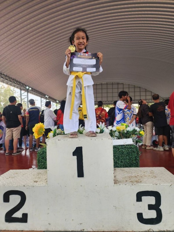 2.เด็กหญิงศรัญญา เพ็งอาทิตย์ นักเรียนอนุบาล 1/2 ได้รับรางวัลชนะเลิศ ประเภทต่อสู้ รุ่นอายุไม่เกิน6 ปี น้ำหนัก 15-18 กิโลกรัม รับรางวัลเหรียญทองพร้อมประกาศนียบัตร |