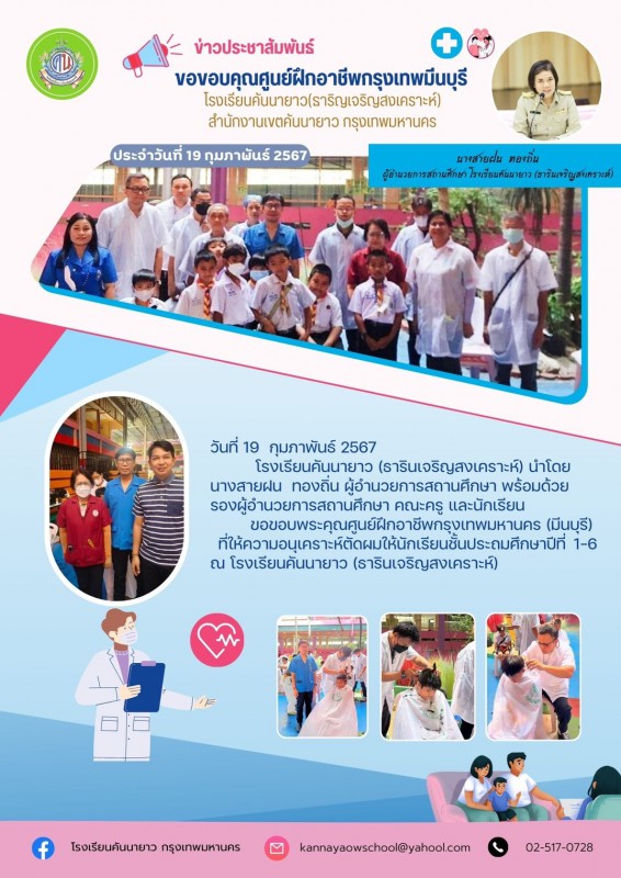 โรงเรียนคันนายาว (ธารินเจริญสงเคราะห์) นำโดยนางสายฝน ทองถิ่น ผู้อำนวยการสถานศึกษา พร้อมด้วยรองผู้อำนวยการสถานศึกษา คณะครู และนักเรียน ขอขอบพระคุณศูนย์ฝึกอาชีพกรุงเทพมหานคร (มีนบุรี) ที่ให้ความอนุเคราะห์ตัดผมให้นักเรียนชั้นประถมศึกษาปีที่ 1-6 ณ โรงเรียนคันนายาว (ธารินเจริญสงเคราะห์) |