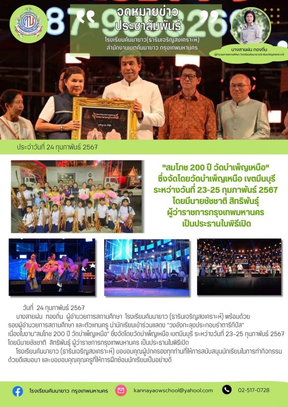 นางสายฝน ทองถิ่น ผู้อำนวยการสถานศึกษา โรงเรียนคันนายาว (ธารินเจริญสงเคราะห์) พร้อมด้วยรองผู้อำนวยการสถานศึกษา และตัวแทนครู นำนักเรียนเข้าร่วมแสดง "วงอังกะลุงประกอบรำตารีกีปัส" เนื่องในงาน"สมโภช 200 ปี วัดบำเพ็ญเหนือ" ซึ่งจัดโดยวัดบำเพ็ญเหนือ เขตมีนบุรี ระหว่างวันที่ 23-25 กุมภาพันธ์ 2567 โดยมีนายชัชชาติ สิทธิพันธุ์ ผู้ว่าราชการกรุงเทพมหานคร เป็นประธานในพิธีเปิด