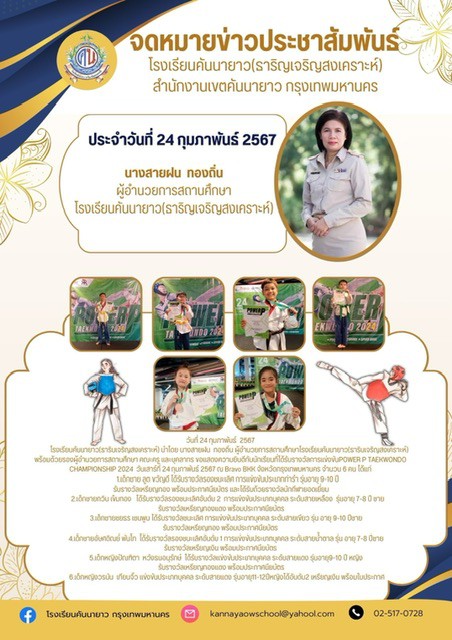 โรงเรียนคันนายาว(ธารินเจริญสงเคราะห์) นำโดย นางสายฝน ทองถิ่น ผู้อำนวยการสถานศึกษาโรงเรียนคันนายาว(ธารินเจริญสงเคราะห์) พร้อมด้วยรองผู้อำนวยการสถานศึกษา คณะครู และบุคลากร ขอแสดงความยินดีกับนักเรียนที่ได้รับรางวัลการแข่งขันPOWER P TAEKWONDO CHAMPIONSHIP 2024 วันเสาร์ที่ 24 กุมภาพันธ์ 2567 ณ Bravo BKK จังหวัดกรุงเทพมหานคร จำนวน 6 คน ได้แก่