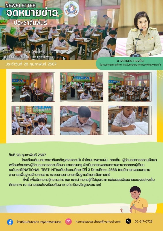 โรงเรียนคันนายาว(ธารินเจริญสงเคราะห์) นำโดยนางสายฝน ทองถิ่น ผู้อำนวยการสถานศึกษา พร้อมด้วยรองผู้อำนวยการสถานศึกษา และคณะครู ดำเนินการทดสอบความสามารถของผู้เรียนระดับชาติ(National Test: NT)ระดับประถมศึกษาปีที่ 3 ปีการศึกษา 2566 โดยมีการทดสอบความสามารถพื้นฐานด้านการอ่าน และความสามารถพื้นฐานด้านคณิตศาสตร์