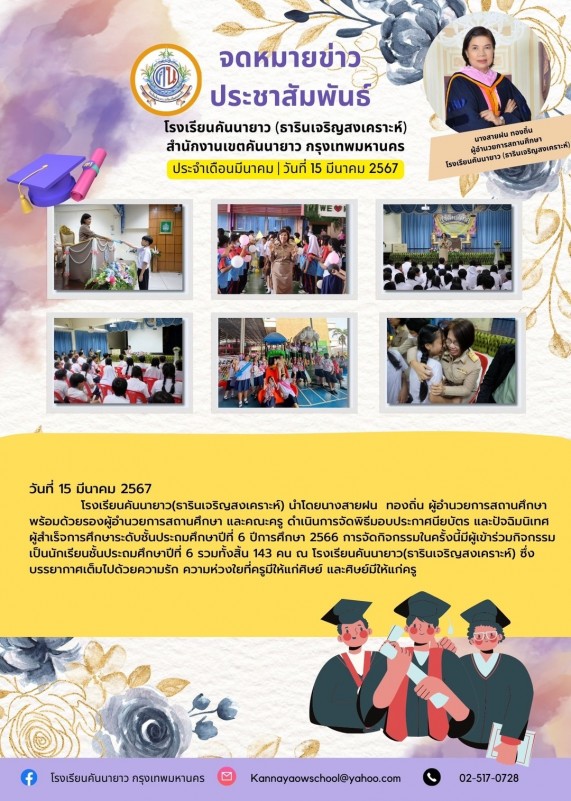 โรงเรียนคันนายาว(ธารินเจริญสงเคราะห์) นำโดยนางสายฝน ทองถิ่น ผู้อำนวยการสถานศึกษา พร้อมด้วยรองผู้อำนวยการสถานศึกษา และคณะครู ดำเนินการจัดพิธีมอบประกาศนียบัตร และปัจฉิมนิเทศ ผู้สำเร็จการศึกษาระดับชั้นประถมศึกษาปีที่ 6 ปีการศึกษา 2566 การจัดกิจกรรมในครั้งนี้มีผู้เข้าร่วมกิจกรรมเป็นนักเรียนชั้นประถมศึกษาปีที่ 6 รวมทั้งสิ้น 143 คน ณ โรงเรียนคันนายาว(ธารินเจริญสงเคราะห์) ซึ่งบรรยากาศเต็มไปด้วยความรัก ความห่วงใยที่ครูมีให้แก่ศิษย์ และศิษย์มีให้แก่ครู