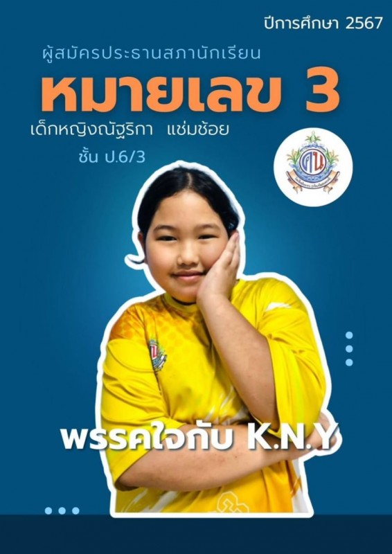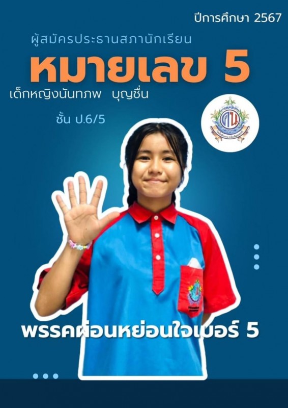 ผลการเลือกตั้ง หมายเลข 5 เด็กหญิงนันทภพ บุญชื่น ชนะการเลือกตั้ง ได้รับการคัดเลือกเป็นประธานนักเรียนโรงเรียนคันนายาว (ธารินเจริญสงเคราะห์) ประจำปีการศึกษา 2567