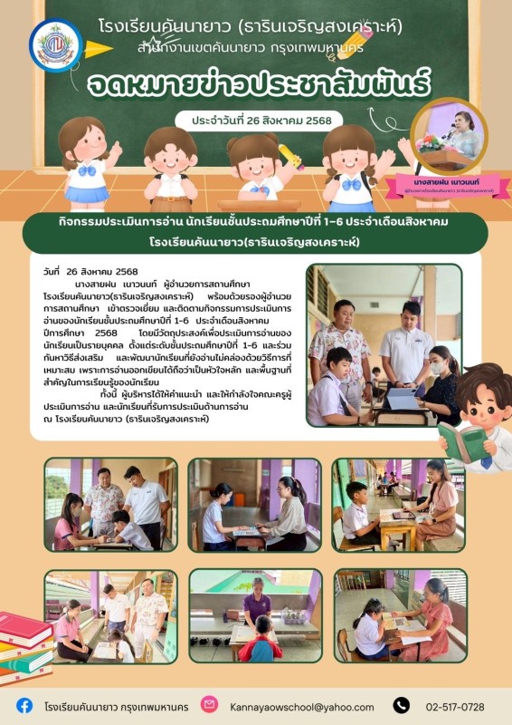 นางสายฝน เนาวนนท์ ผู้อำนวยการสถานศึกษา โรงเรียนคันนายาว(ธารินเจริญสงเคราะห์) พร้อมด้วยรองผู้อำนวยการสถานศึกษา เข้าตรวจเยี่ยม และติดตามกิจกรรมการประเมินการอ่านของนักเรียนชั้นประถมศึกษาปีที่ 1-6 ประจำเดือนสิงหาคม ปีการศึกษา 2568 โดยมีวัตถุประสงค์เพื่อประเมินการอ่านของนักเรียนเป็นรายบุคคล ตั้งแต่ระดับชั้นประถมศึกษาปีที่ 1-6 และร่วมกันหาวิธีส่งเสริม และพัฒนานักเรียนที่ยังอ่านไม่คล่องด้วยวิธีการที่เหมาะสม เพราะการอ่านออกเขียนได้ถือว่าเป็นหัวใจหลัก และพื้นฐานที่สำคัญในการเรียนรู้ของนักเรียน