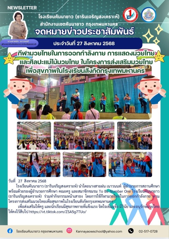 โรงเรียนคันนายาว (ธารินเจริญสงเคราะห์) นำโดยนางสายฝน เนาวนนท์ ผู้อำนวยการสถานศึกษา พร้อมด้วยรองผู้อำนวยการศึกษา คณะครู และสมาชิกชมรม To Be Number One โรงเรียนคันนายาว (ธารินเจริญสงเคราะห์) ร่วมทำกิจกรรมหน้าเสาธง โดยการใช้กีฬามวยไทยในการออกกำลังกาย ตามโครงการส่งเสริมมวยไทยเพื่อสุขภาพในโรงเรียนสังกัดกรุงเทพมหานคร