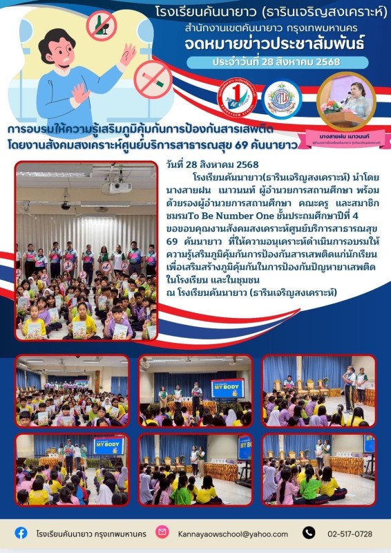 โรงเรียนคันนายาว(ธารินเจริญสงเคราะห์) นำโดยนางสายฝน เนาวนนท์ ผู้อำนวยการสถานศึกษา พร้อมด้วยรองผู้อำนวยการสถานศึกษา คณะครู และสมาชิกชมรมTo Be Number One ชั้นประถมศึกษาปีที่ 4 ขอขอบคุณงานสังคมสงเคราะห์ ศูนย์บริการสาธารณสุข 69 คันนายาว ที่ให้ความอนุเคราะห์ดำเนินการอบรมให้ความรู้เสริมภูมิคุ้มกันการป้องกันสารเสพติดแก่นักเรียน เพื่อเสริมสร้างภูมิคุ้มกันในการป้องกันปัญหายาเสพติดในโรงเรียน และในชุมชน ณ โรงเรียนคันนายาว (ธารินเจริญสงเคราะห์)