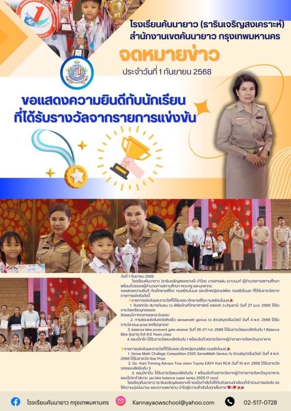 โรงเรียนคันนายาว (ธารินเจริญสงเคราะห์) นำโดย นางสายฝน เนาวนนท์ ผู้อำนวยการสถานศึกษา พร้อมด้วยรองผู้อำนวยการสถานศึกษา คณะครู และบุคลากร ขอแสดงความยินดี กับเด็กชายสิโรจ กมลรัตนโนบล และเด็กหญิงณปพัชร กมลรัตโนบล ที่ได้รับรางวัลจากรายการแข่งขันดังนี้