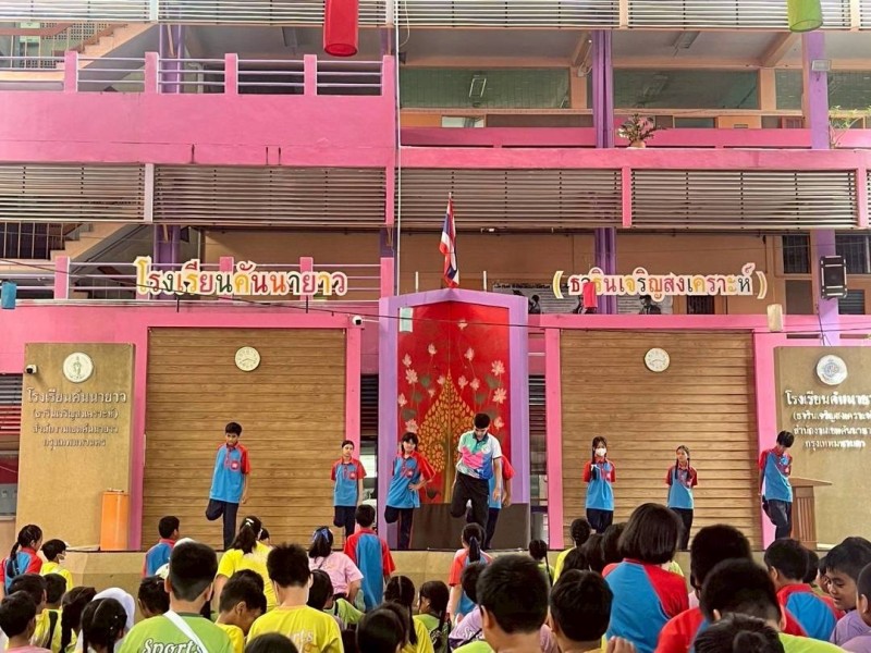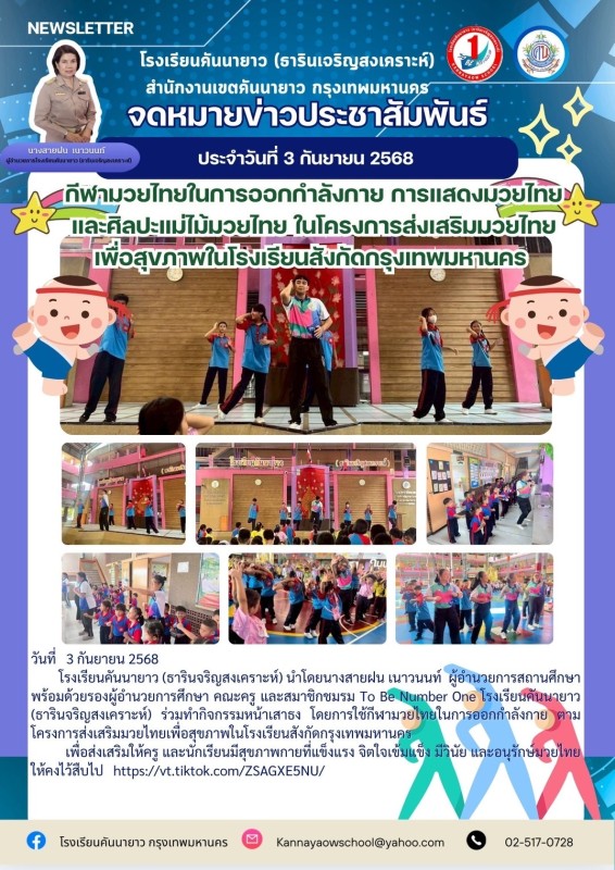 โรงเรียนคันนายาว (ธารินเจริญสงเคราะห์) นำโดยนางสายฝน เนาวนนท์ ผู้อำนวยการสถานศึกษา พร้อมด้วยรองผู้อำนวยการศึกษา คณะครู และสมาชิกชมรม To Be Number One โรงเรียนคันนายาว (ธารินเจริญสงเคราะห์) ร่วมทำกิจกรรมหน้าเสาธง โดยการใช้กีฬามวยไทยในการออกกำลังกาย ตามโครงการส่งเสริมมวยไทยเพื่อสุขภาพในโรงเรียนสังกัดกรุงเทพมหานคร