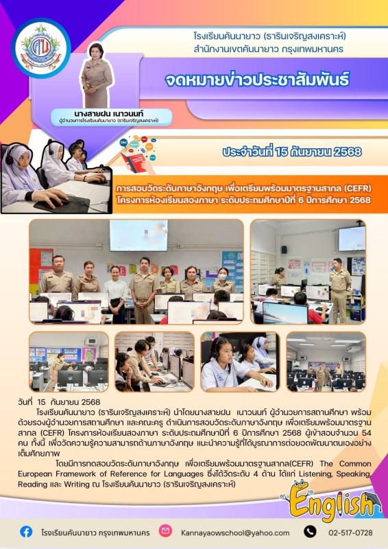โรงเรียนคันนายาว (ธารินเจริญสงเคราะห์) นำโดยนางสายฝน เนาวนนท์ ผู้อำนวยการสถานศึกษา พร้อมด้วยรองผู้อำนวยการสถานศึกษา และคณะครู ดำเนินการสอบวัดระดับภาษาอังกฤษ เพื่อเตรียมพร้อมมาตรฐานสากล (CEFR) โครงการห้องเรียนสองภาษา ระดับประถมศึกษาปีที่ 6 ปีการศึกษา 2568 ผู้เข้าสอบจำนวน 54 คน ทั้งนี้ เพื่อวัดความรู้ความสามารถด้านภาษาอังกฤษ แนะนำความรู้ที่ได้บูรณาการต่อยอดพัฒนาตนเองอย่างเต็มศักยภาพ
