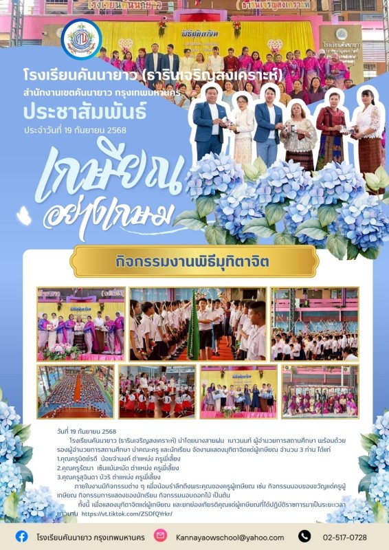 โรงเรียนคันนายาว (ธารินเจริญสงเคราะห์) นำโดยนางสายฝน เนาวนนท์ ผู้อำนวยการสถานศึกษา พร้อมด้วยรองผู้อำนวยการสถานศึกษา นำคณะครู และนักเรียน จัดงานแสดงมุทิตาจิตแด่ผู้เกษียณ จำนวน 3 ท่าน ได้แก่